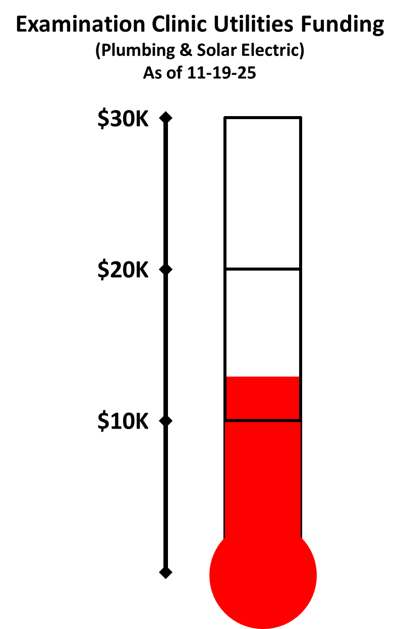 Great news! In August the Examination Clinic building was complete and fully funded. Medical equipment in storage in the Maternity clinic and the school can now be moved into the new building. However, it will not be functional until we raise funds for the plumbing and solar electricity--about $30,000. Our goal is to dedicate the building in June of 2026 if funding is provided in time.